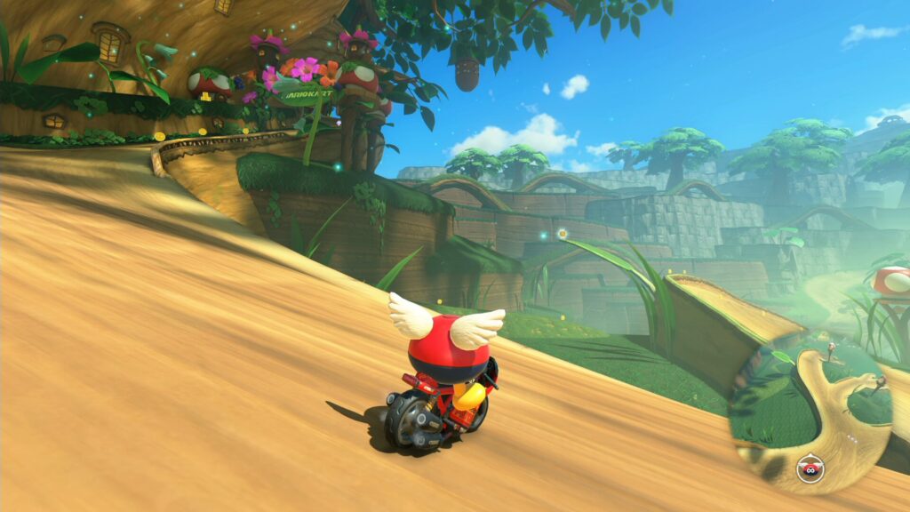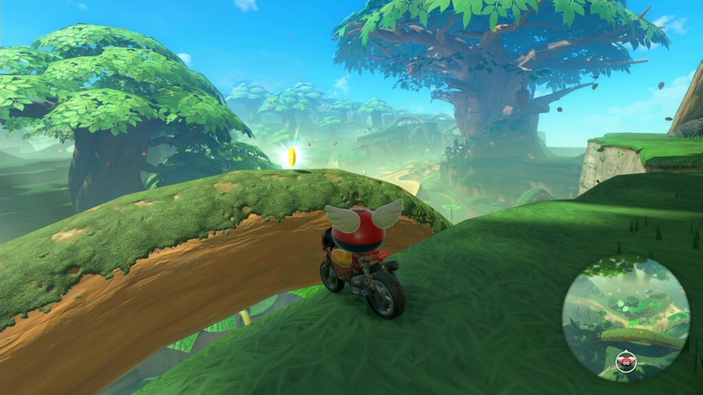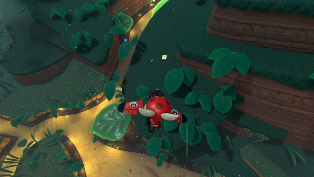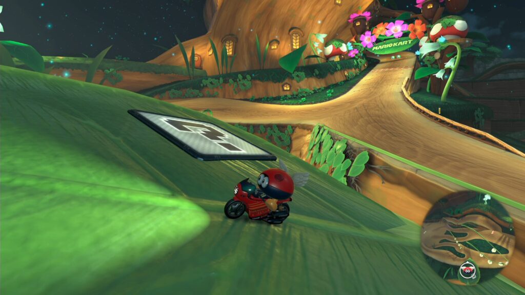 【M092】どんぐりツリーハウスから南方向へ少し離れたところにある、道路を覆う空洞の木の幹の上。どんぐりツリーハウスのスタート地点からコースを道なりに進んで左カーブの坂道を上り、左手にヨッシーズのキッチンカーがある分岐を左折して、ハテナパネルを過ぎた先にある青いダッシュ板を踏んで南方向へグライドすれば来られる。