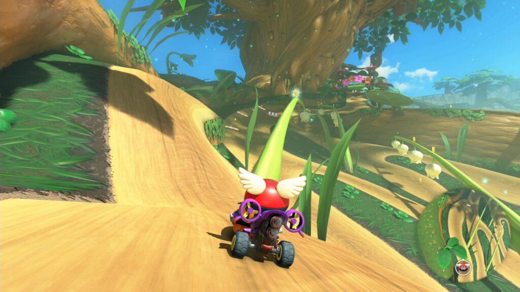 【M090】どんぐりツリーハウスのスタート地点からUターンして、目の前の長い左カーブの先にある葉の上。葉の付け根付近には壁があるが、道を横切るように置いてあるコインを目安にチャージジャンプをすれば飛び越えられる。壁の上の茎をレールスライドすると、近くまでは行けるが、葉に飛び乗ろうとしても勢いが強くて通り過ぎてしまう。