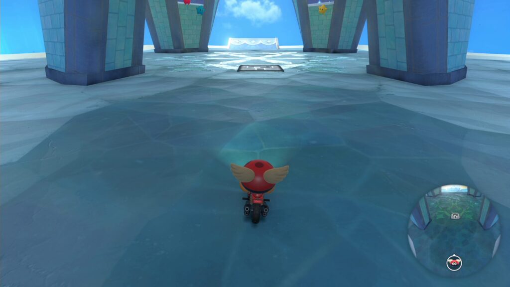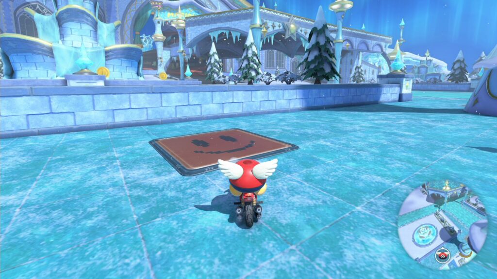上記「さいこうほう!てんもんだいの青コイン」のPスイッチがある輪から、さらに外側にある輪の南西部。ドリフトのミニターボやダッシュ板で加速しつつ、アイスボールをかわしながら、制限時間内にゴールを目指す。難易度はやや低め。