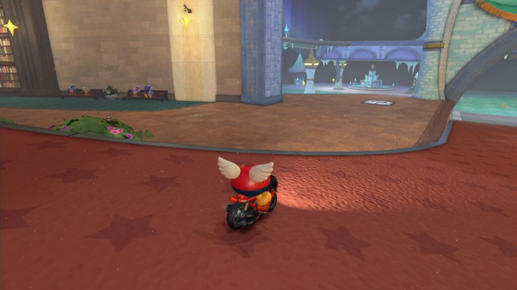 ④ロゼッタてんもんだいの建物内で上層フロア。コースを道なりに進み、途中のカーブから建物内(図書館の上)に飛び降りる。