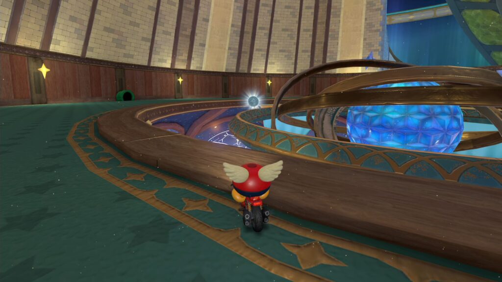 【M163】ロゼッタてんもんだいのコース途中のカーブから建物内(図書館の上)に飛び降りた先で、エリア中央部の輪の上。輪には加速をつけてからジャンプすれば飛び乗ることができる。コインを取った後、外側の床に戻ってくることもできる(土管の先にPスイッチがある)。
