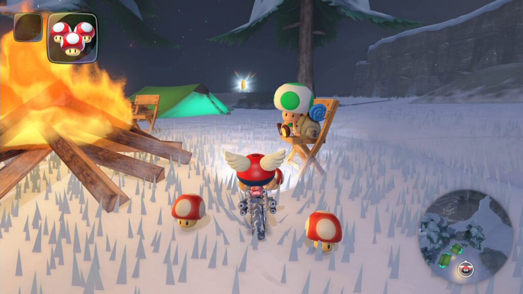 ロゼッタてんもんだいから南西側へ出て、少し離れた雪原の中。キノコ2個を利用しながら被弾を回避して青コイン8枚を集める。難易度はやや低め。