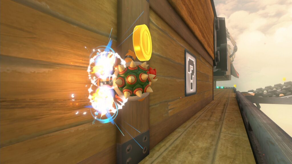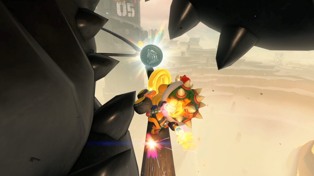 【P005】キラーシップから北東方向へ少し離れて、クッパキャッスル方面へグライドした際の着地点付近で、キラーシップへ飛んでいくための大砲がある坂道の横。レールスライドをしながら青コイン8枚を集める。難易度はやや低め。