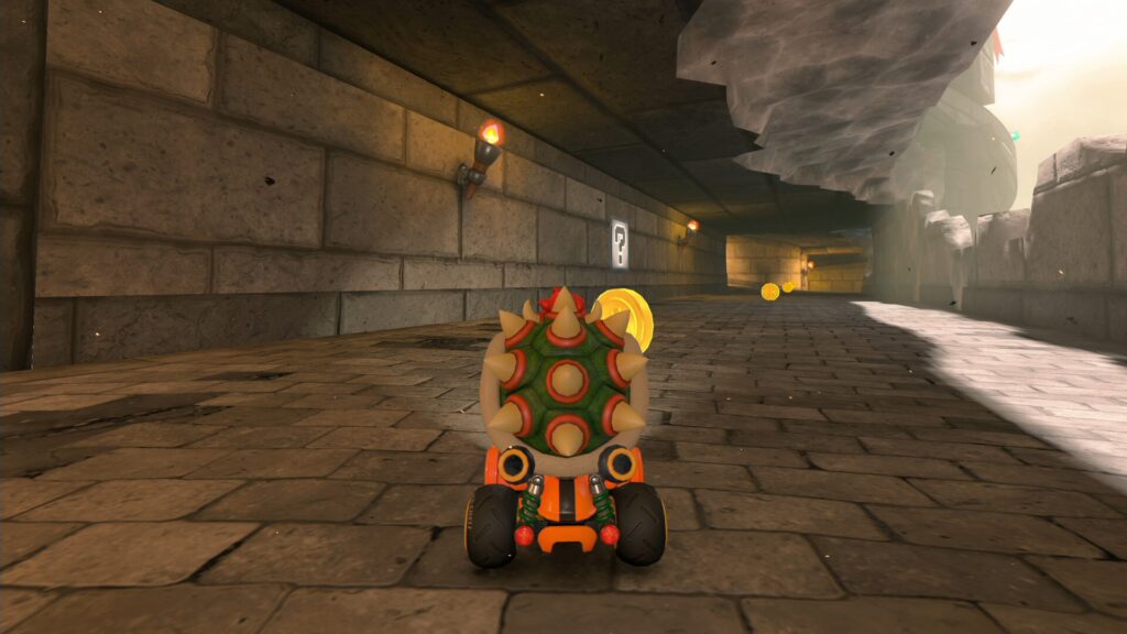 【P006】キラーシップから北東方向へ少し離れて、クッパキャッスルの外城壁の上の通路の西端で、そこへ繋がる石畳の道路との境目付近。カクバッタンをよけるか、あるいはジャンプ台として利用しつつ、制限時間内にゴールを目指す。難易度は低め。