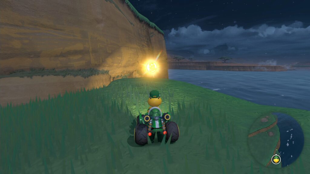 【P228】ピーチスタジアムから南東方向へ出てすぐの湾内で、水が流れ落ちた先にある小高い岩の上。波を利用したジャンプアクションやドリフトのミニターボで加速しつつ、制限時間内にゴールを目指す。難易度は普通。