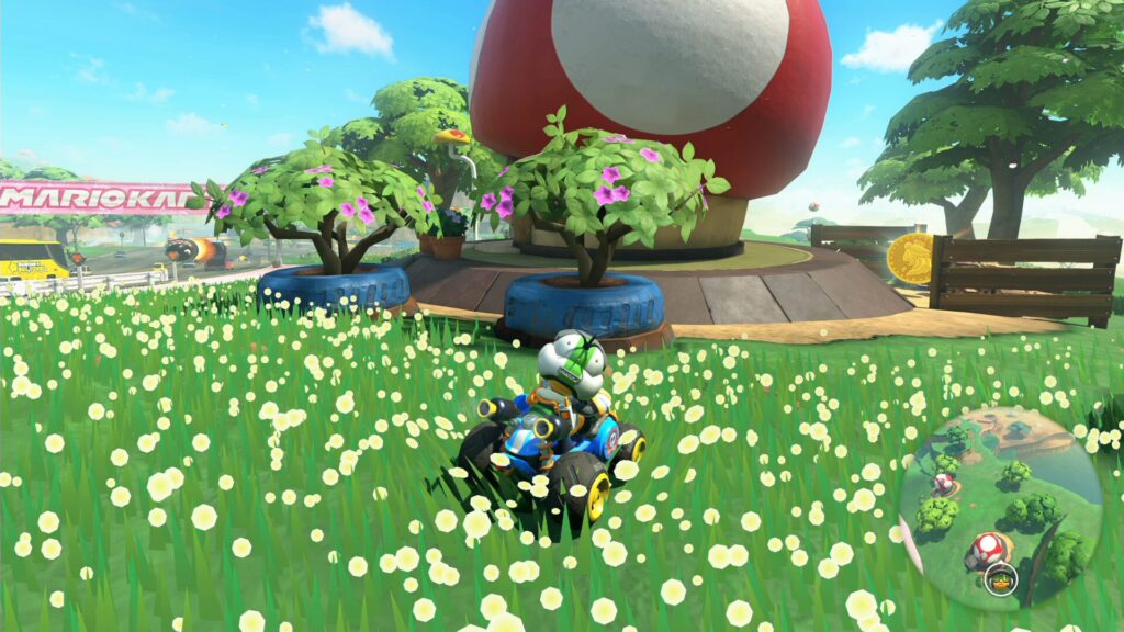 【M122】ピーチスタジアムから南東方向へ大通りに沿って少し離れて、ピンク色の「MARIOKART」の横断幕手前から南方向へ少し外れたところにあるキノコの家の裏。
