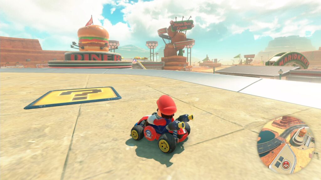 【P086】マリオブラザーズサーキット北側の下を通っている道路上。ダッシュフードやジャンプアクションによる加速を利用して、制限時間内にゴールを目指す。難易度は低め。