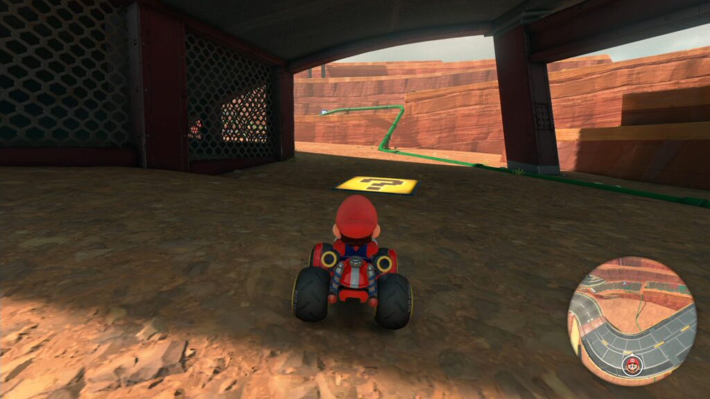 ②マリオブラザーズサーキットのスタート地点から北西方向の橋の下。ワープ直後からだと後方へ進んでコースを道なりに少し逆走して、右カーブした先にある橋の手前から回り込む。