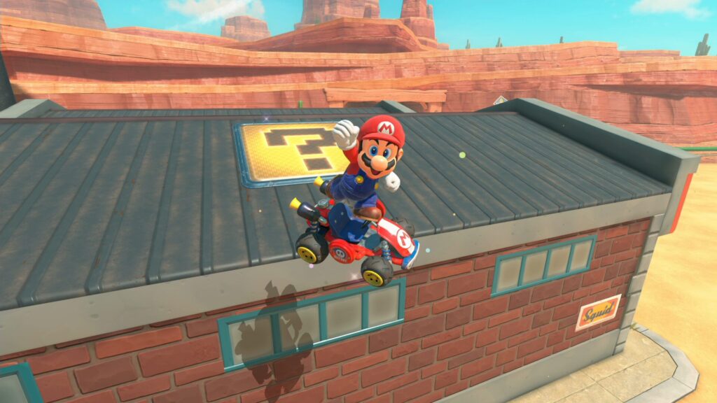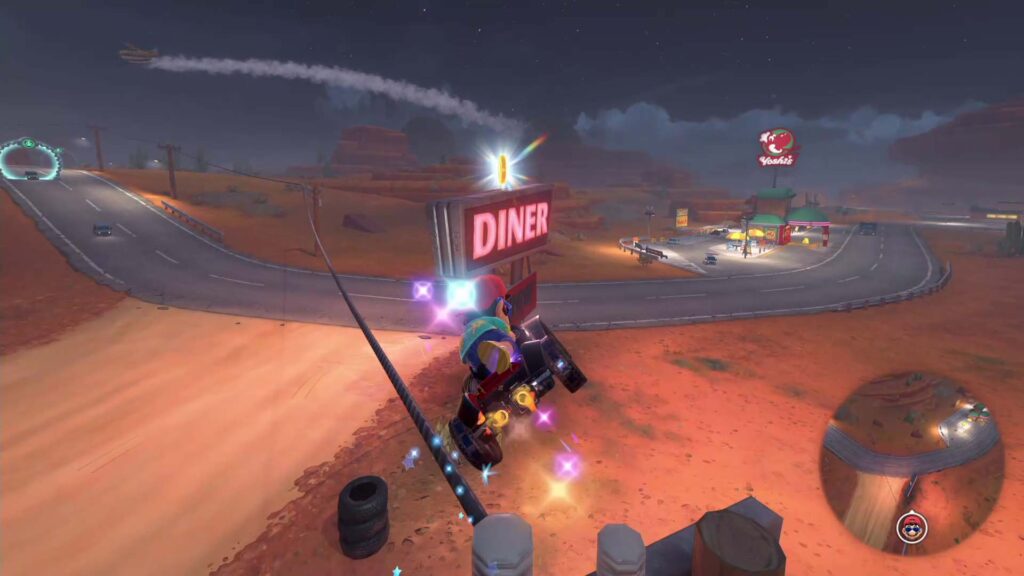 【M040】マリオブラザーズサーキットから東方向へ少し離れて、三又交差点付近にある「DINER」の看板の上。マリオブラザーズサーキット北東側出入り口から東方向へ出て(トンネルはくぐらない)、未舗装道路を進んですぐの道路わきから電線にレールスライドし、電線上の最後の直線の中間付近でジャンプアクションを入れて加速してから、曲がるギリギリで再度ジャンプすれば飛び乗れる。