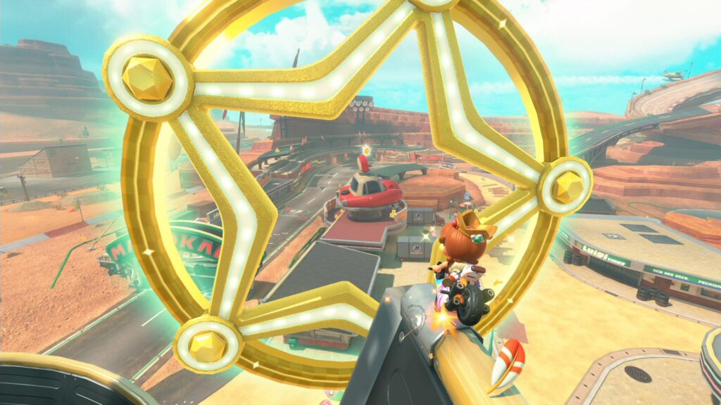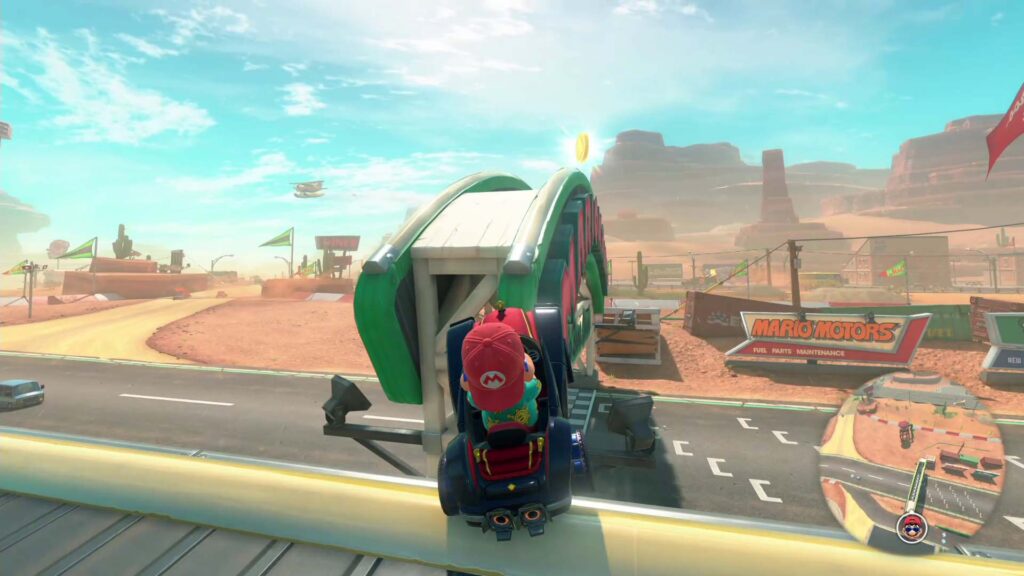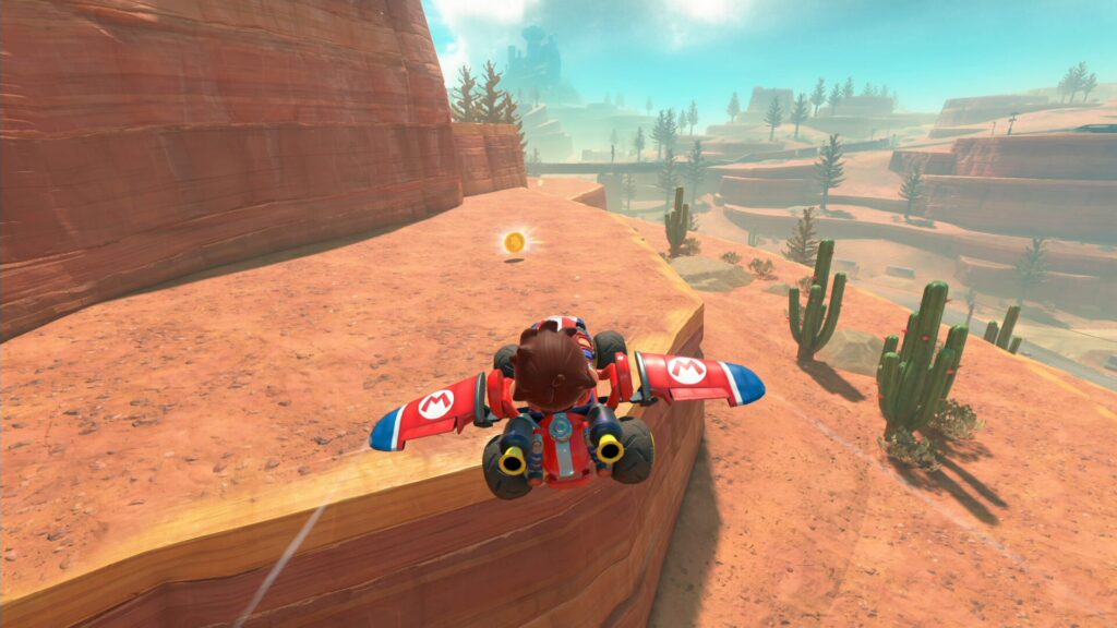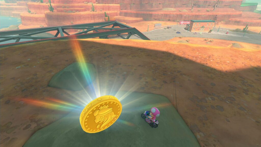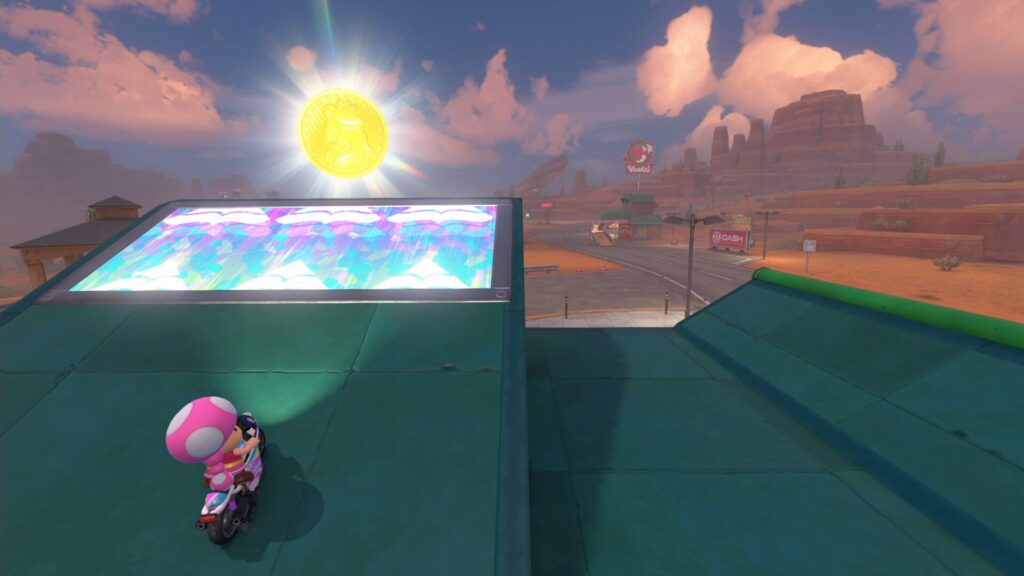 【M043】マリオブラザーズサーキットから南方向へ道路に沿ってやや離れて、岩山に囲まれた地帯で、線路の鉄橋からは少し北東方向の道路わきにある青いダッシュ板を踏んで、南方向の空中にあるコインを目安にグライドし、そのさらに先の高台。