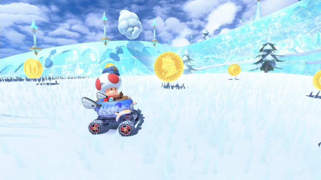 ロゼッタてんもんだいから南西側へ出て、少し離れた雪原の中。キノコ2個を利用しながら被弾を回避して青コイン8枚を集める。難易度はやや低め。