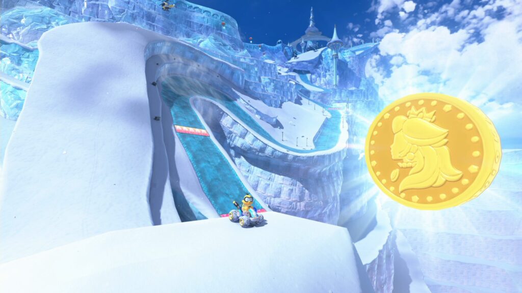 上記「さいこうほう!てんもんだいの青コイン」のPスイッチがある輪から、さらに外側にある輪の南西部。ドリフトのミニターボやダッシュ板で加速しつつ、アイスボールをかわしながら、制限時間内にゴールを目指す。難易度はやや低め。