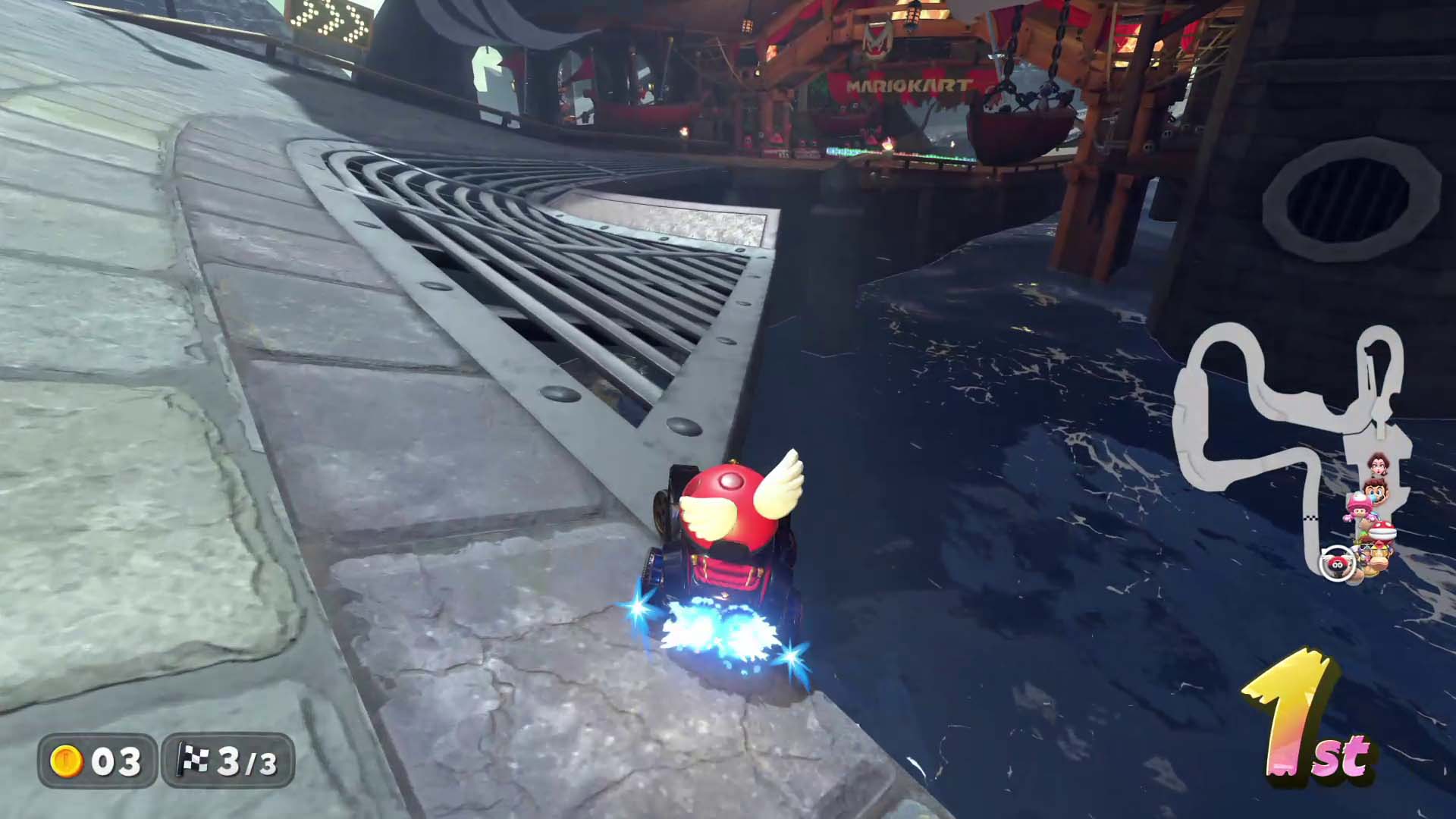 ワリオシップで逃げ切って1位。やや前の地点でキノコ持ちの1位だったが、サンダーを食らったので回避した下位に抜かれるかと思った。アイテム無しでできることは限られてたが、やはりタイムアタックをやるメリットは大きいと感じた。