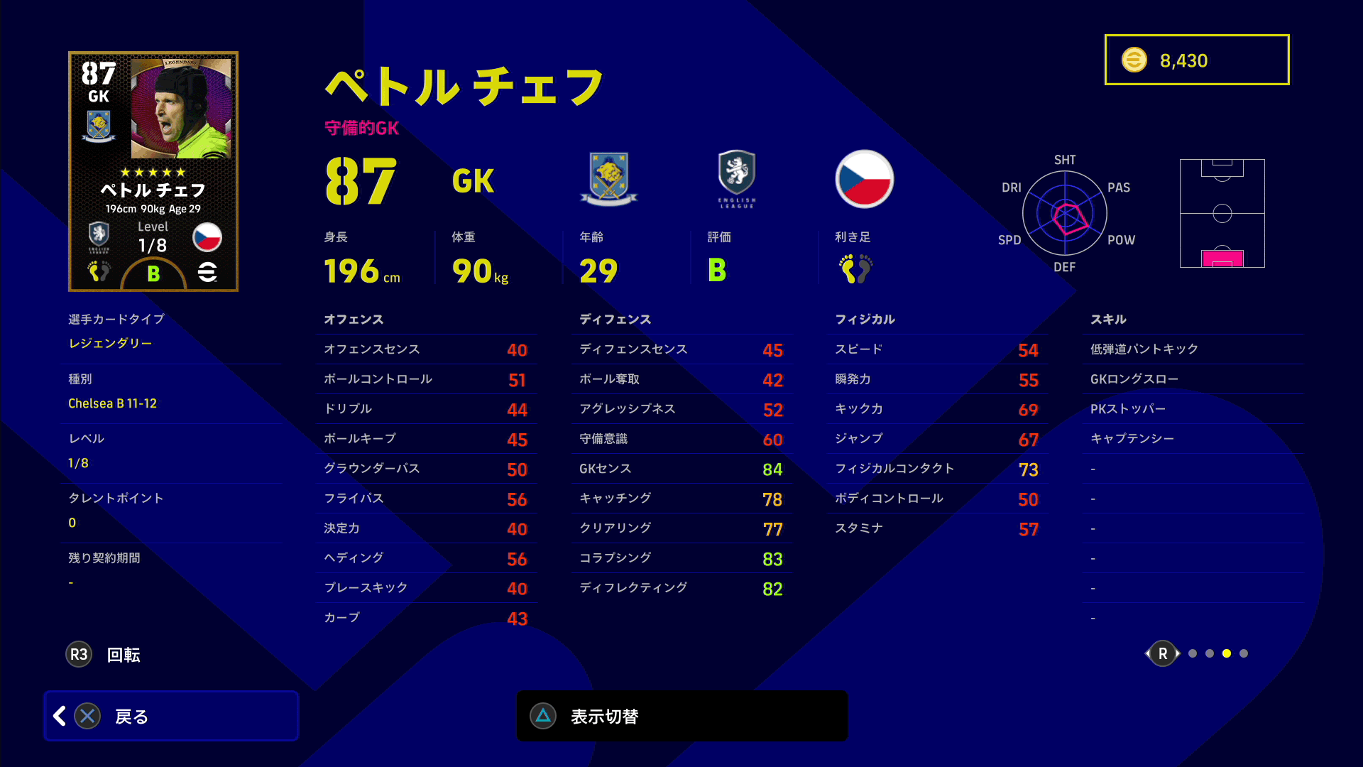 また、コラプシングとディフレクティングの能力値が高いので、シュートの距離にかかわらずセービングが成功しやすくなっています。