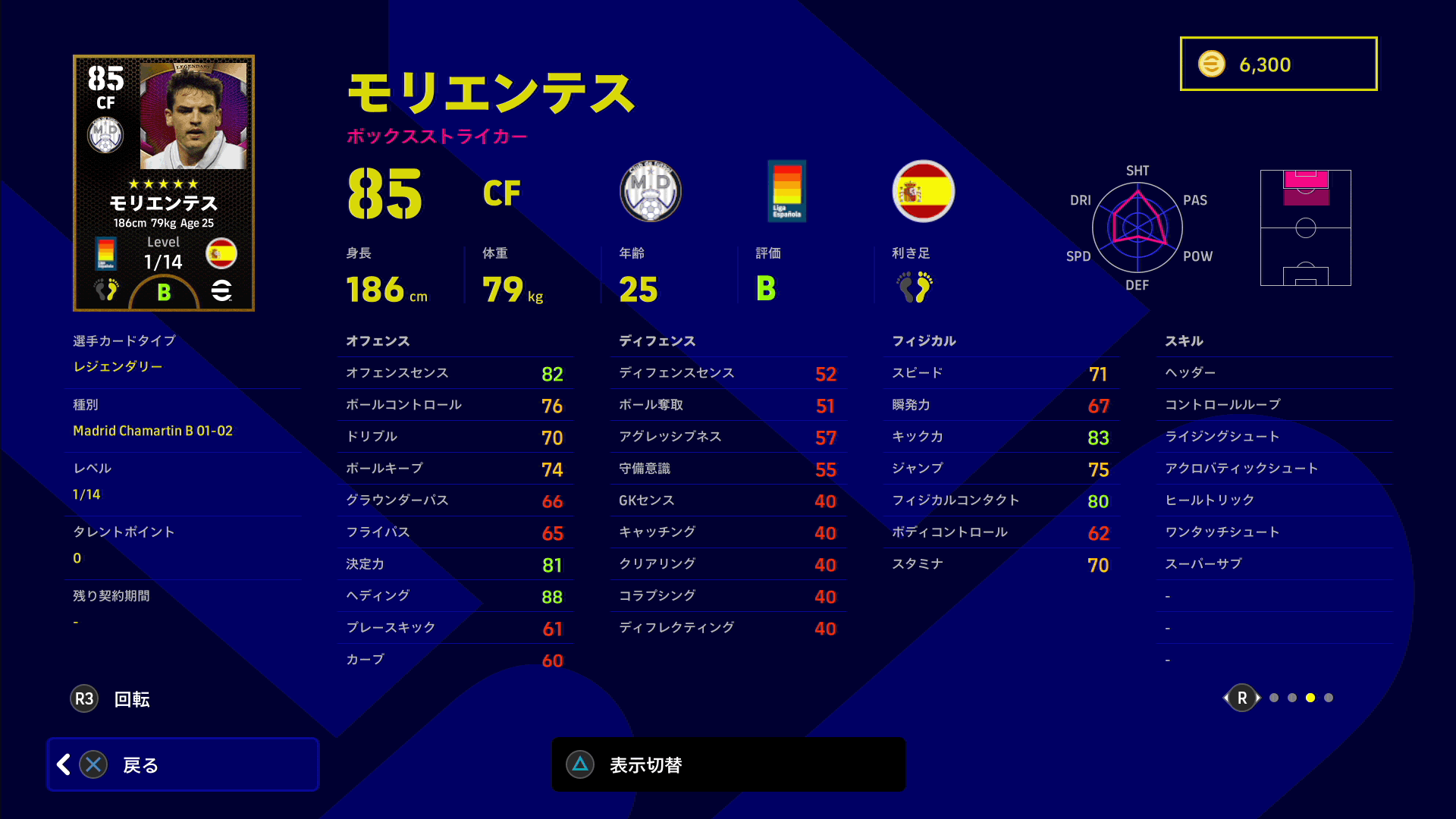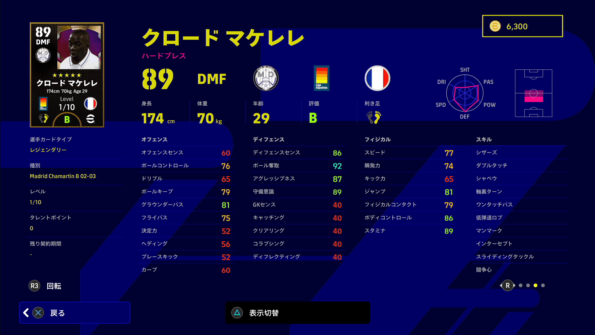 同ポジションの他選手と比較するとディフェンス能力が低めなうえに、ディフェンス関連のスキルを持っていません。