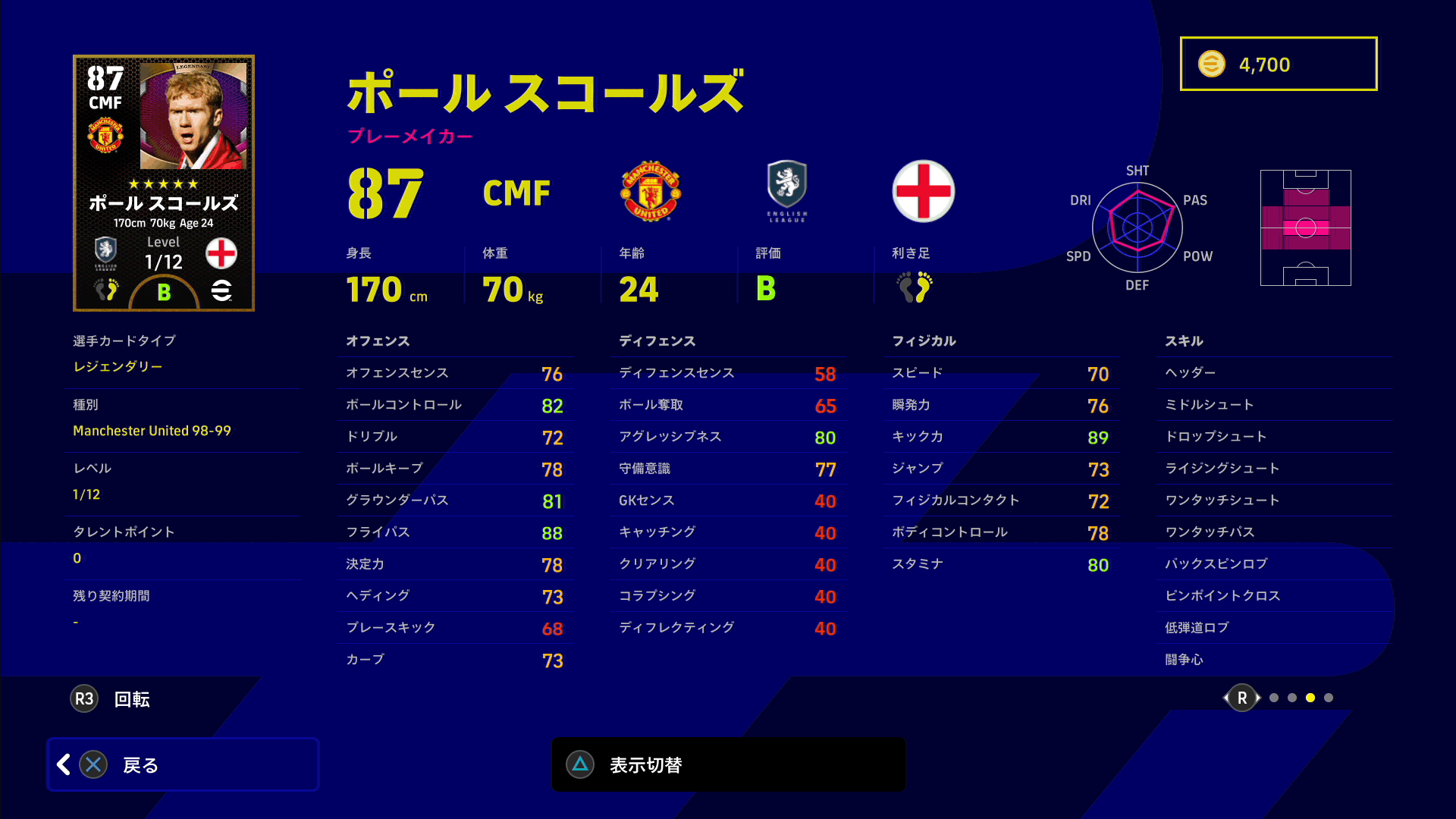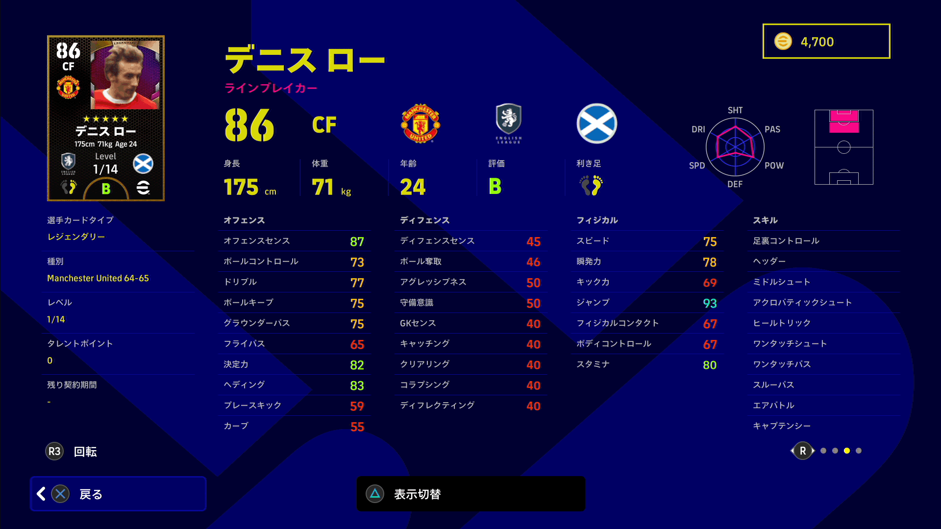 同ポジションの他選手と比較するとフィジカルコンタクトとボディコントロールがいずれも低いので、マークに付かれると能力通りのプレーが厳しくなります。