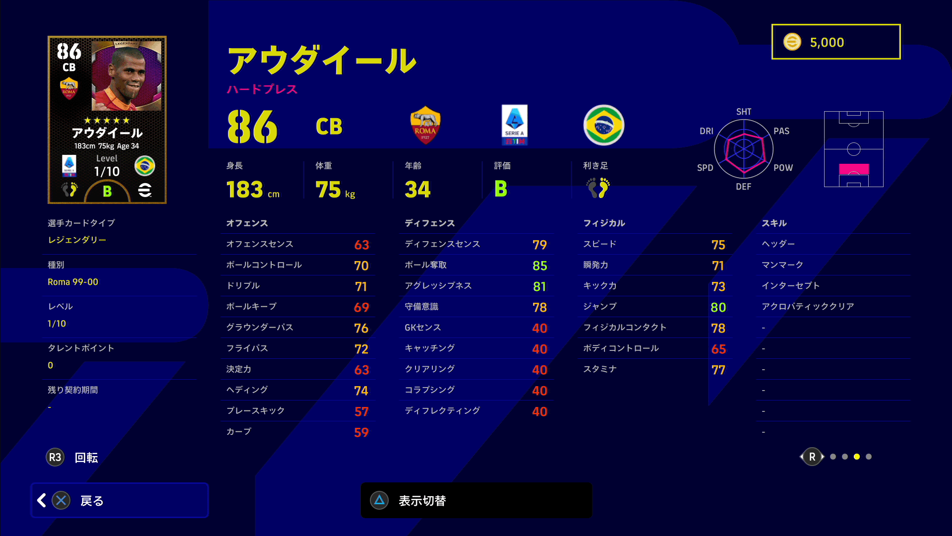 同ポジションの他選手と比較するとディフェンスセンスやフィジカルコンタクトが低めなうえに、所持スキルが少ないです。