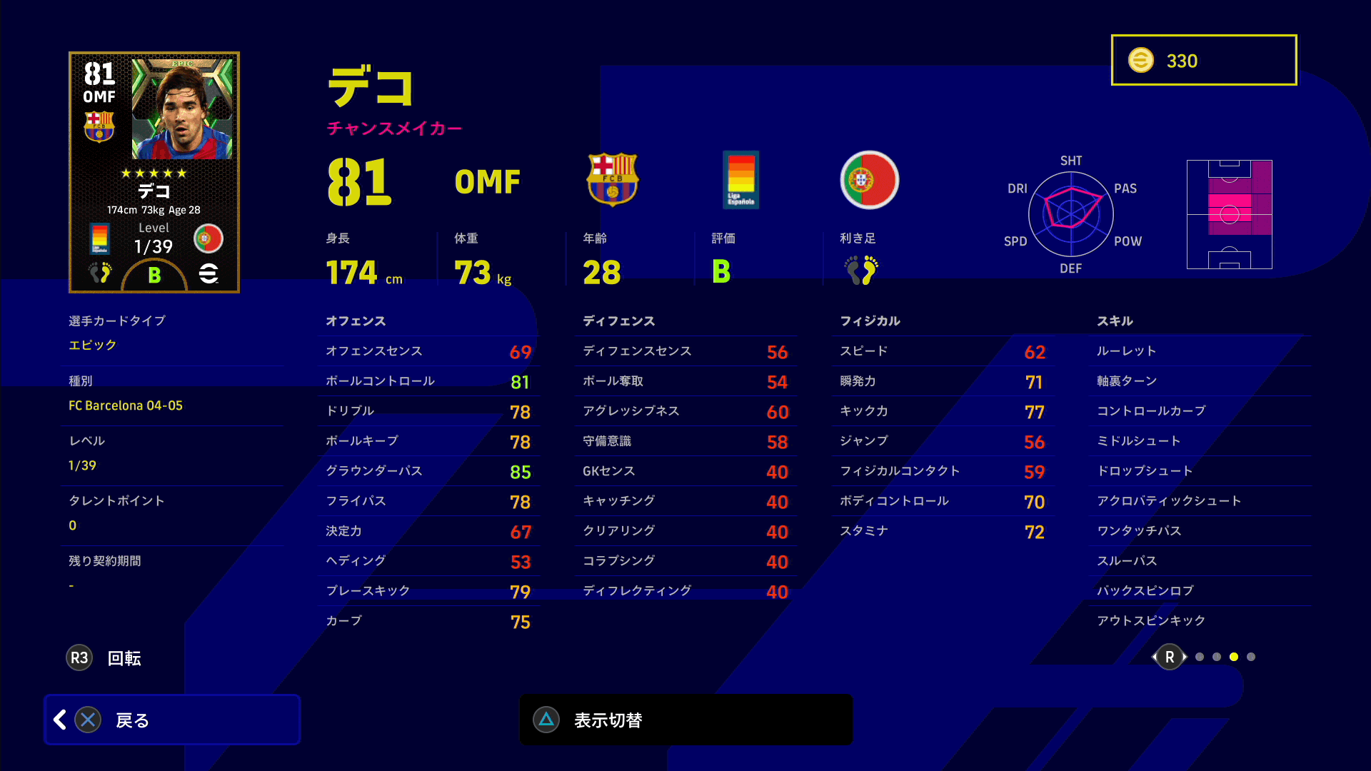 しかし、ボールコントロール・ドリブル・ボールキープの能力値が非常に高く、パスや決定力の能力値も高めで、さらには逆足精度が最高なので、ボールを受けてからドリブル・パス・シュートの有力な選択肢が多いです。