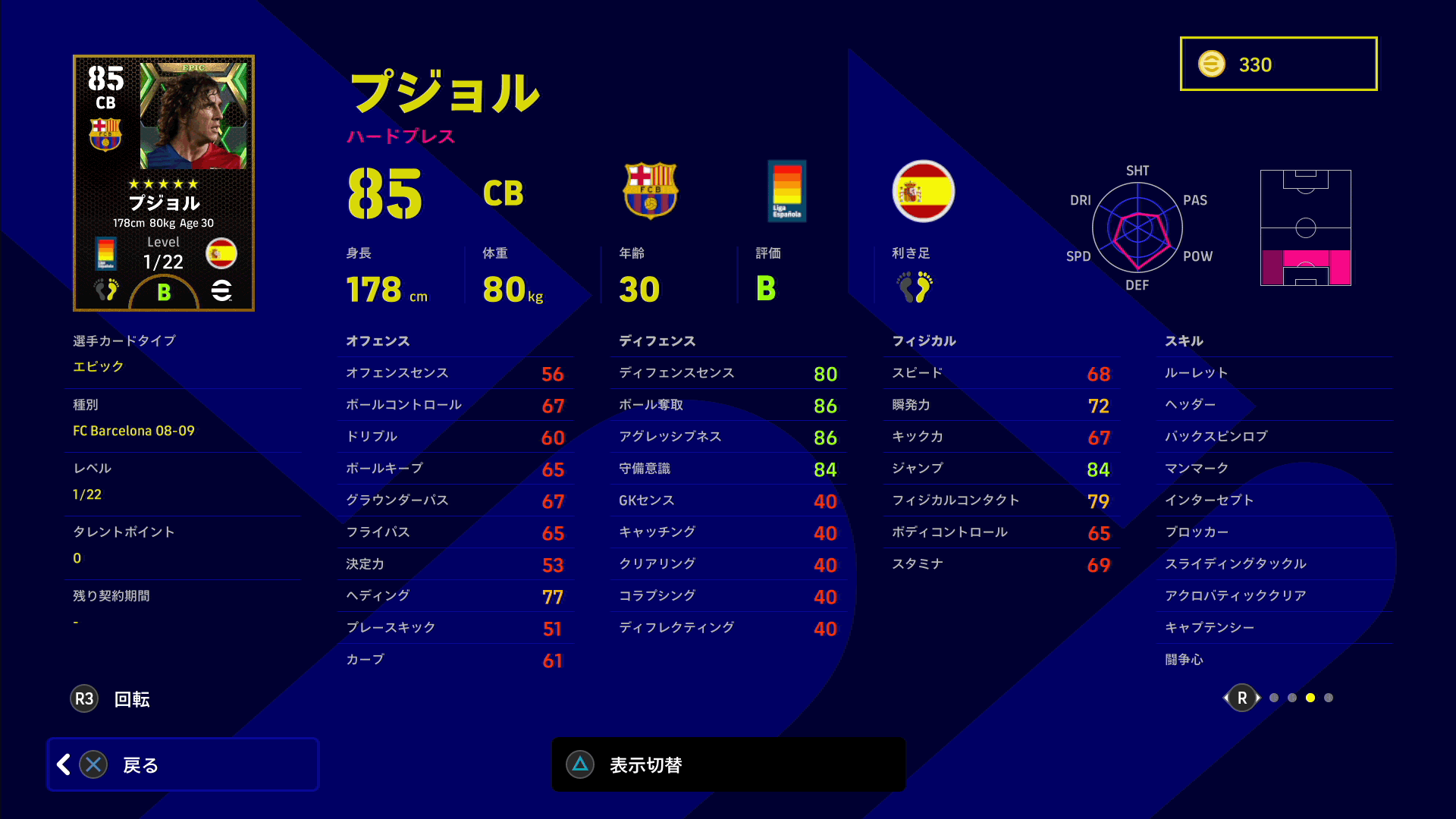 プジョルの最大の魅力はボール奪取とアグレッシブネスの能力値が非常に高いことです。