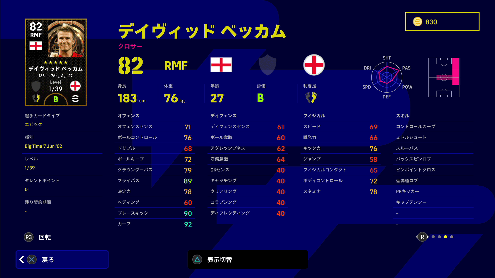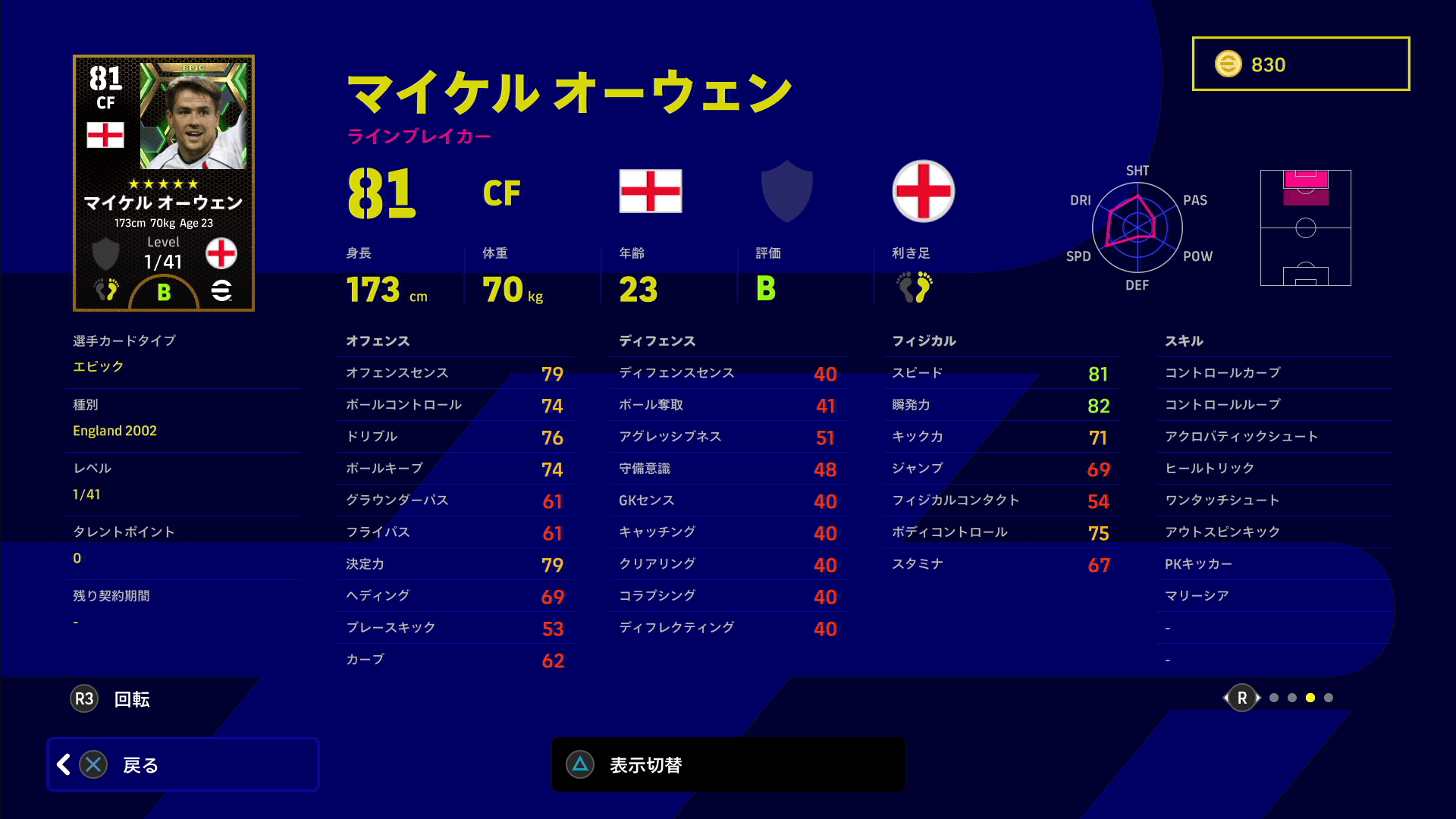 同ポジションの他選手と比較するとスピード・瞬発力・ドリブルの能力値が低いので、