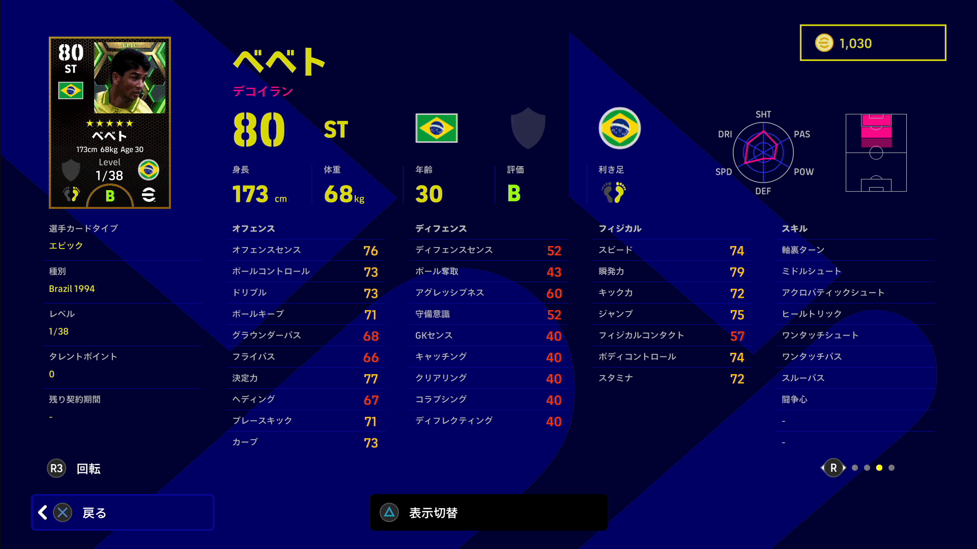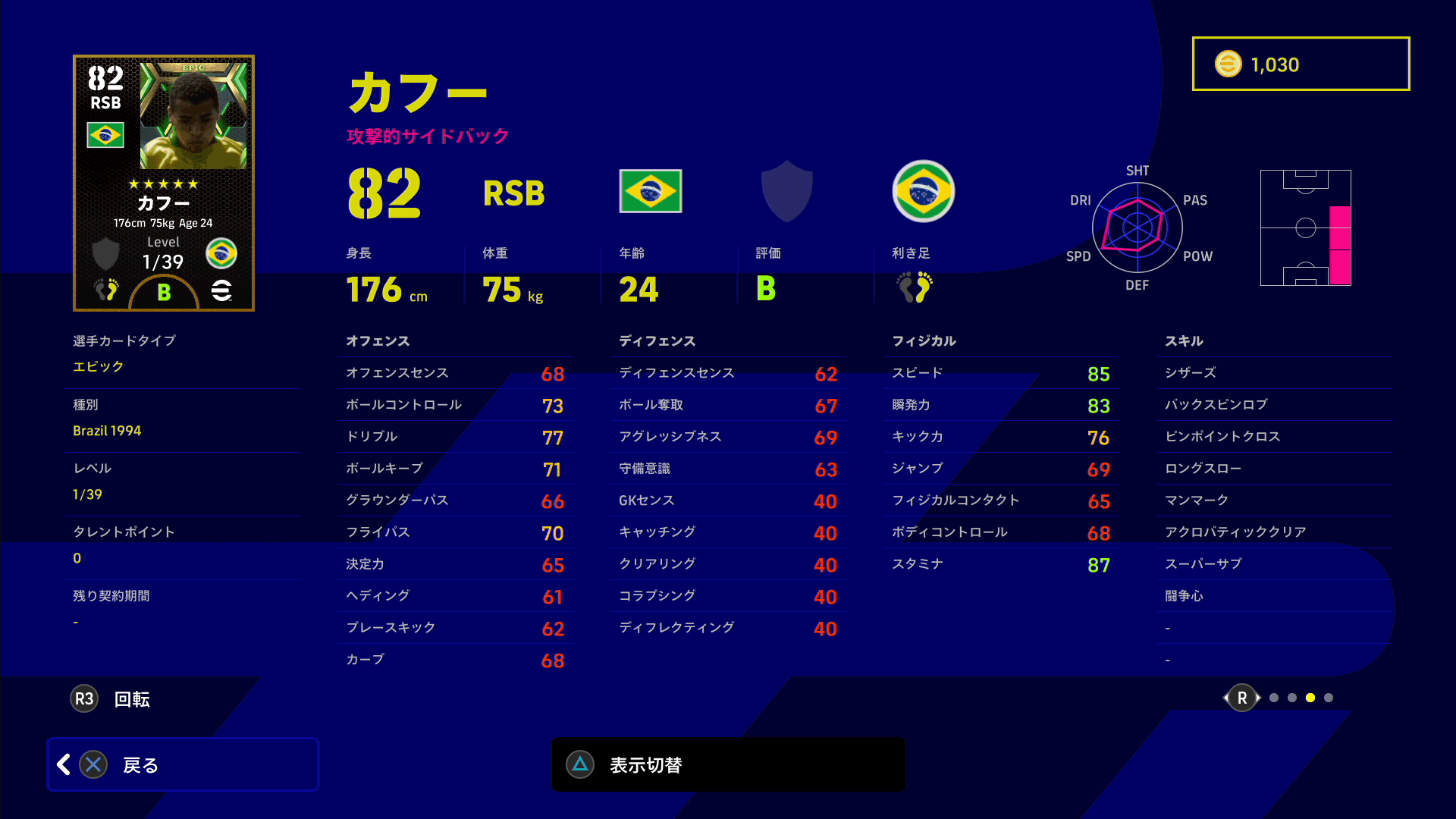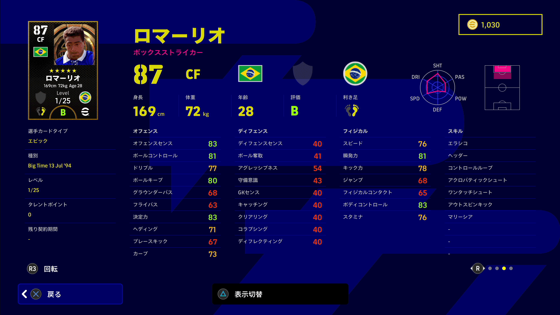 また、オフェンスセンス・ボールコントロール・決定力・ボディコントロールの能力値が非常に高いので、ゴールマウスを背にしてパスを受けても、ターンやドリブルで打開してシュートまで持ち込みやすいです。