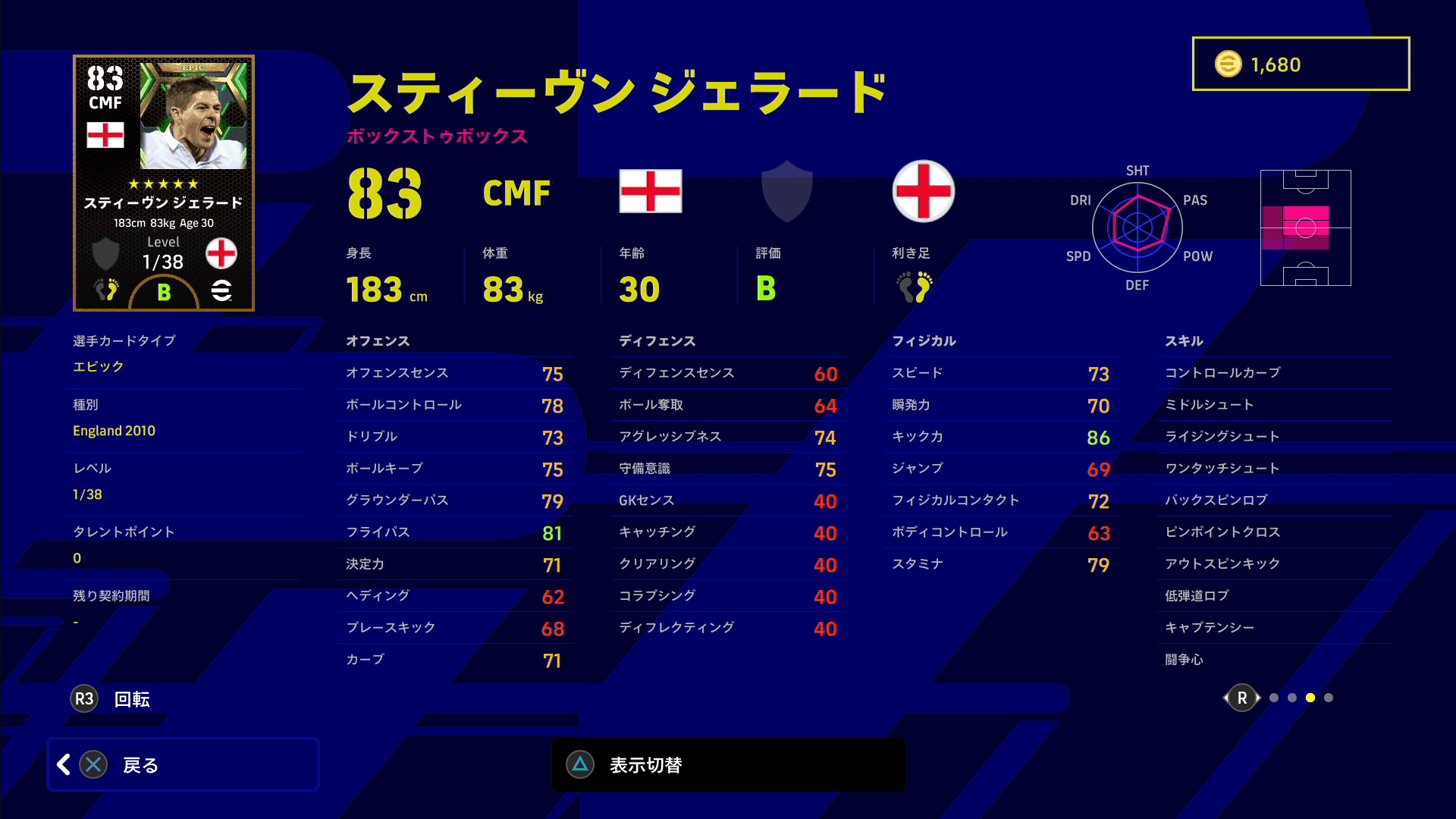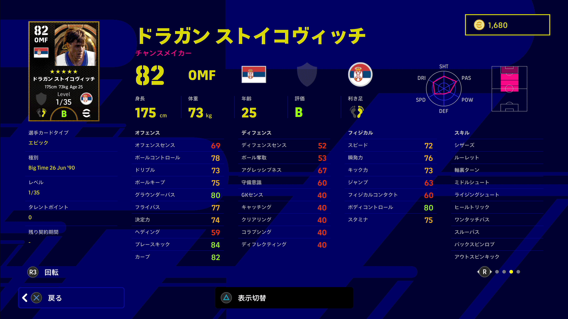 しかし、グラウンダーパスの能力値が高いうえに、パス関連の主要スキルを押さえているので、様々な場面で精度の高いパスを出すことができます。