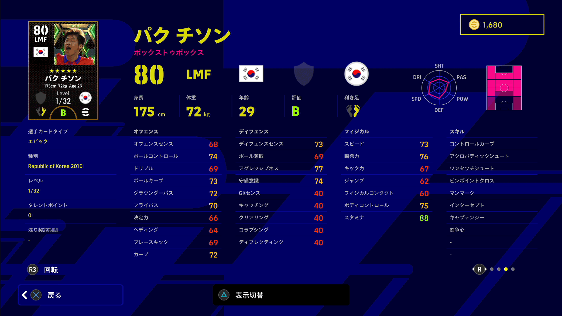 パク チソンはRMF/LMF/RWG/LWG/CMF/OMF/STで、プレースタイルは