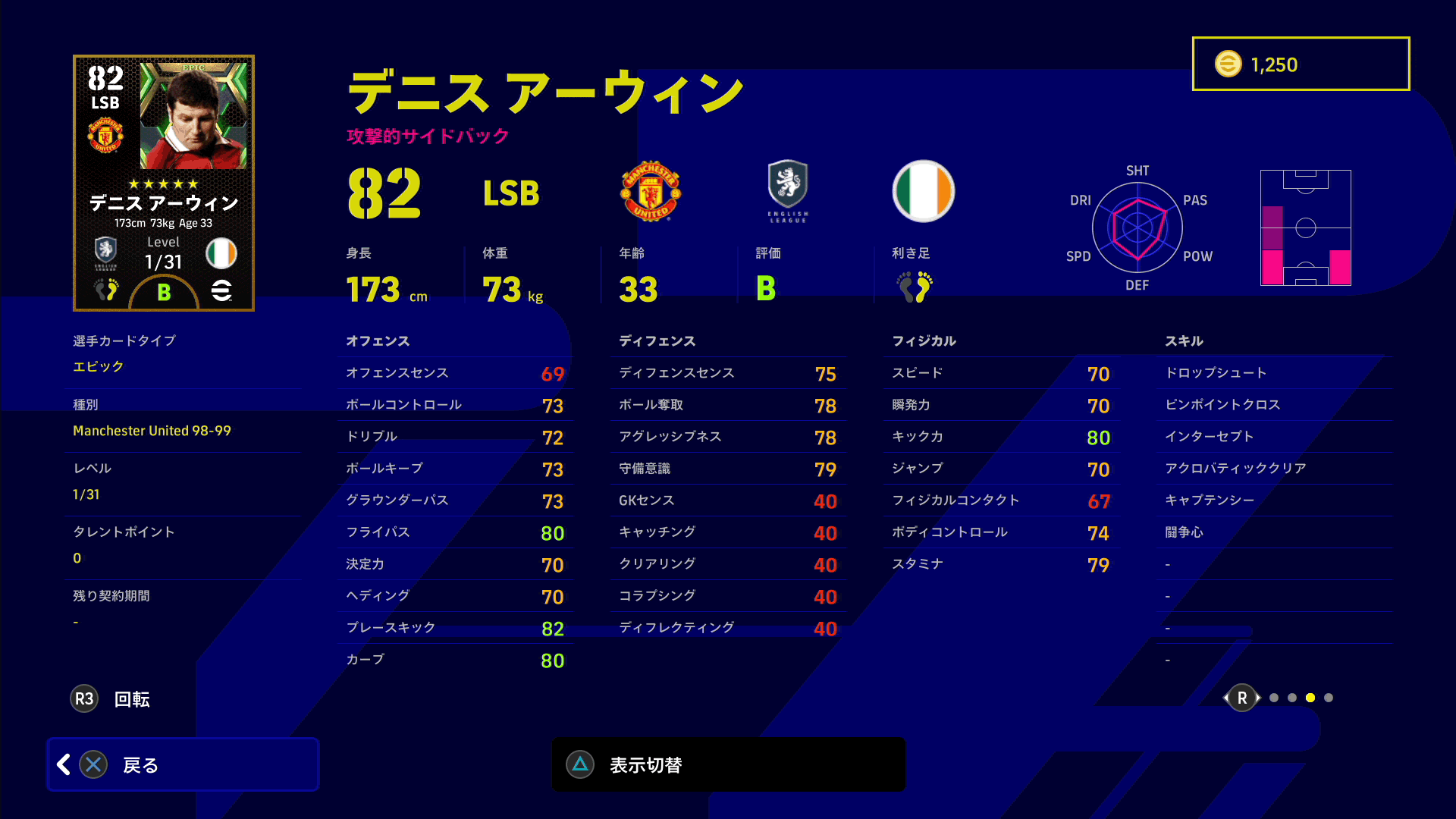 同ポジションの他選手と比較するとスピードが少し遅めのうえに、持っているスキルの数が少ないです。