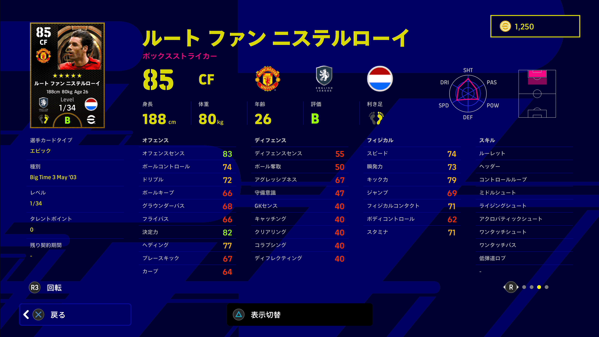 利き足が右なので、中央突破やシュートを主に狙う場合はLSB、クロスを主に狙う場合はRSBで起用すると良いでしょう。