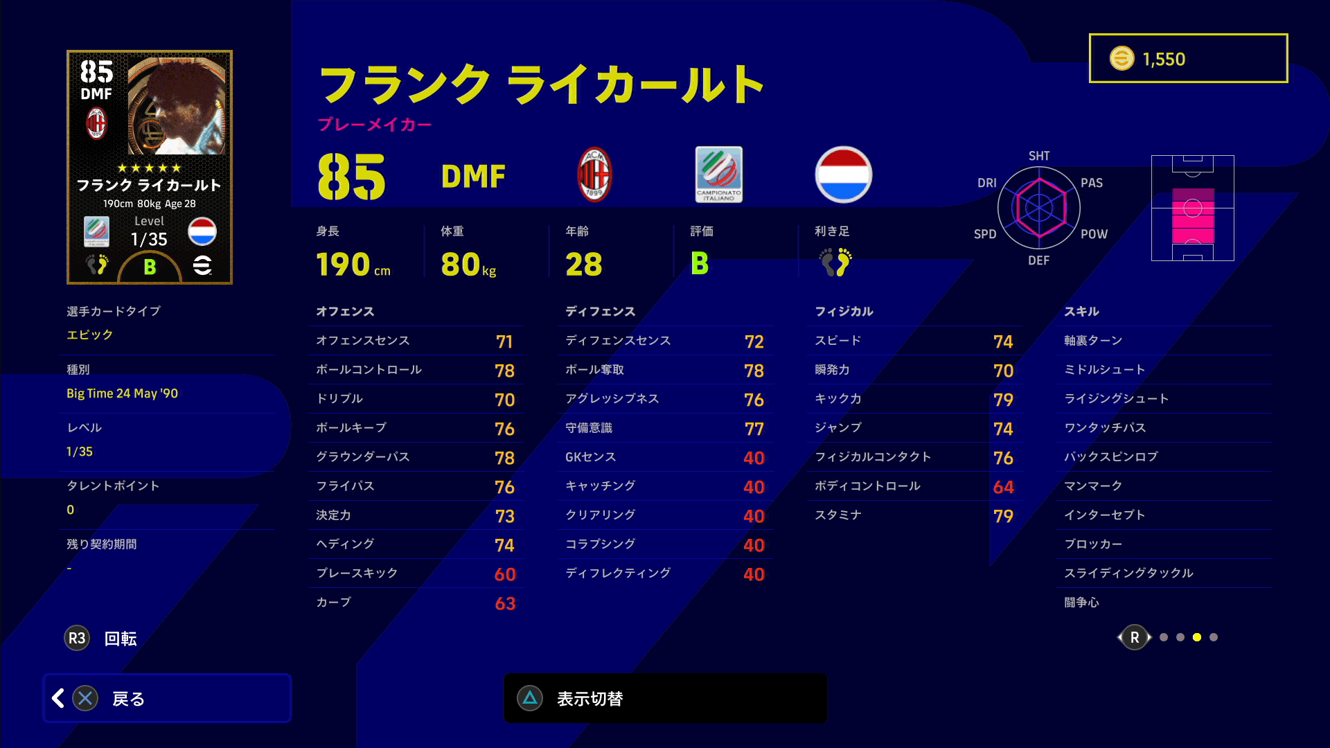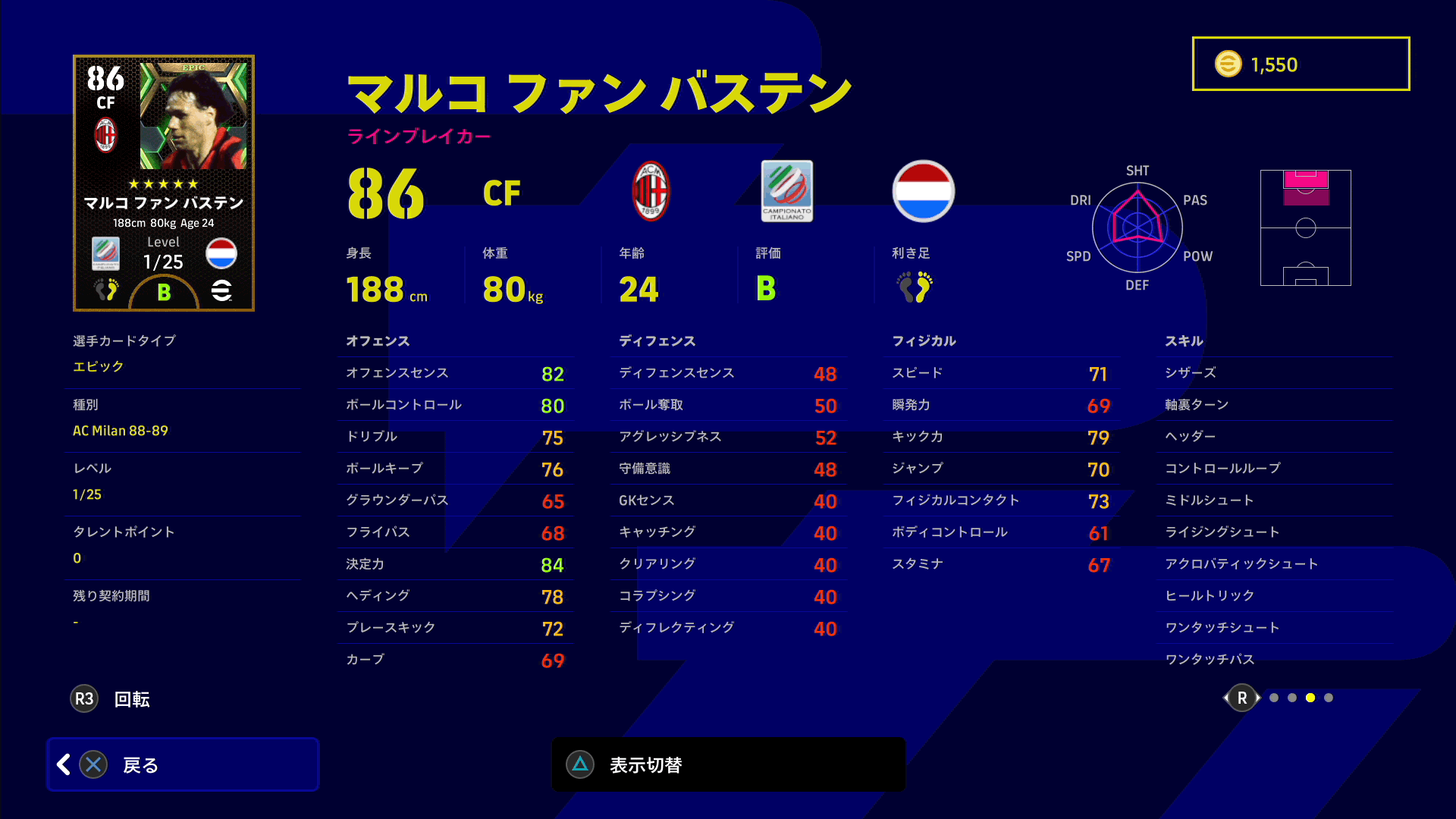同ポジションの他選手と比較するとドリブル・ボールキープ・ボディコントロールの能力値が低いので、操作感が重くてボールの保持が難しいです。