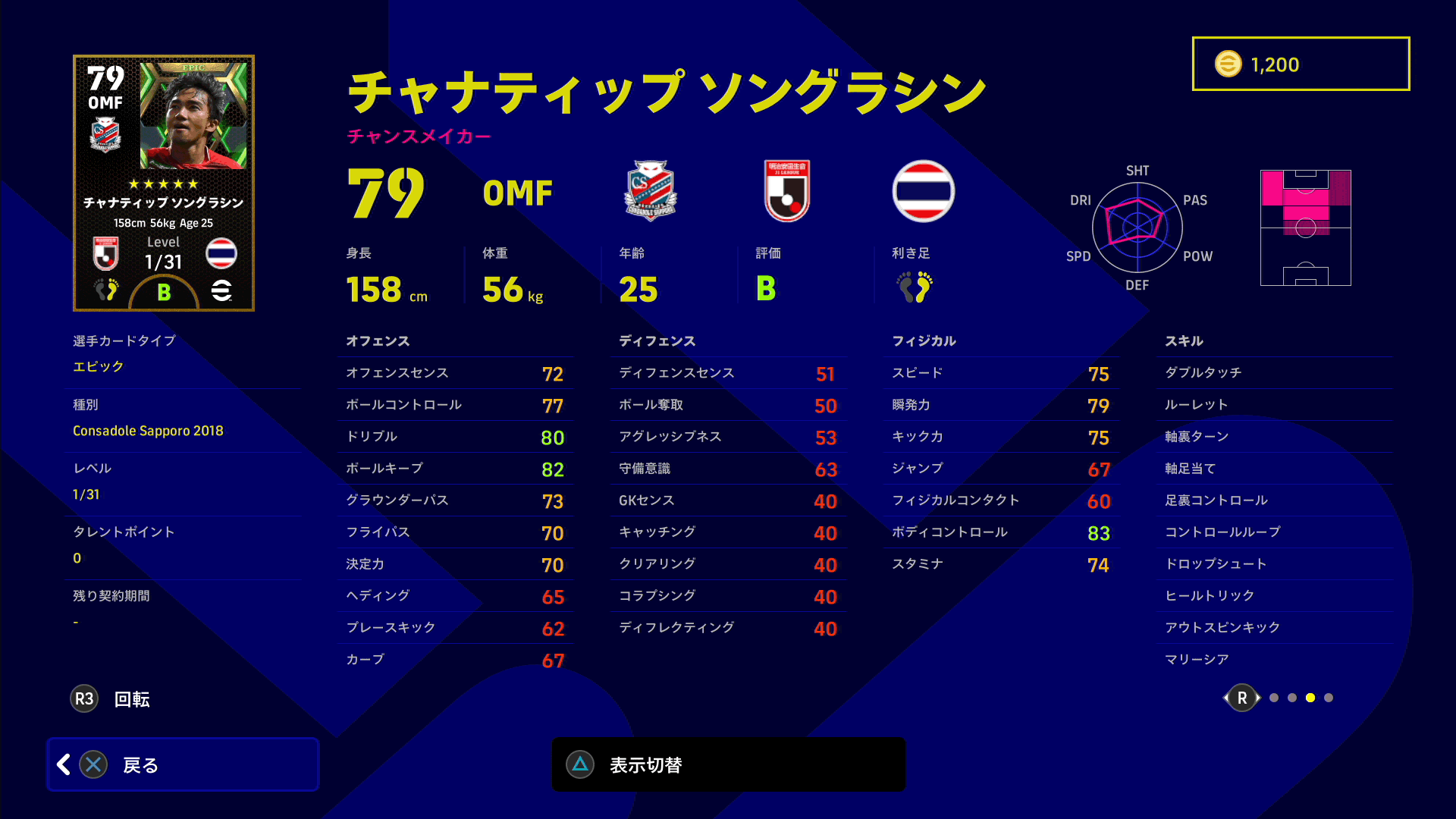 しかし、グラウンダーパスの能力値が高いうえに、パス関連の主要スキルを押さえているので、様々な場面で精度の高いパスを出すことができます。