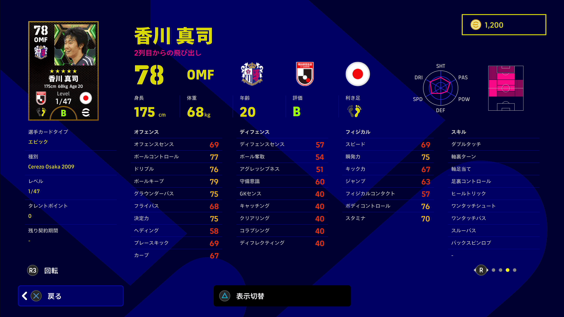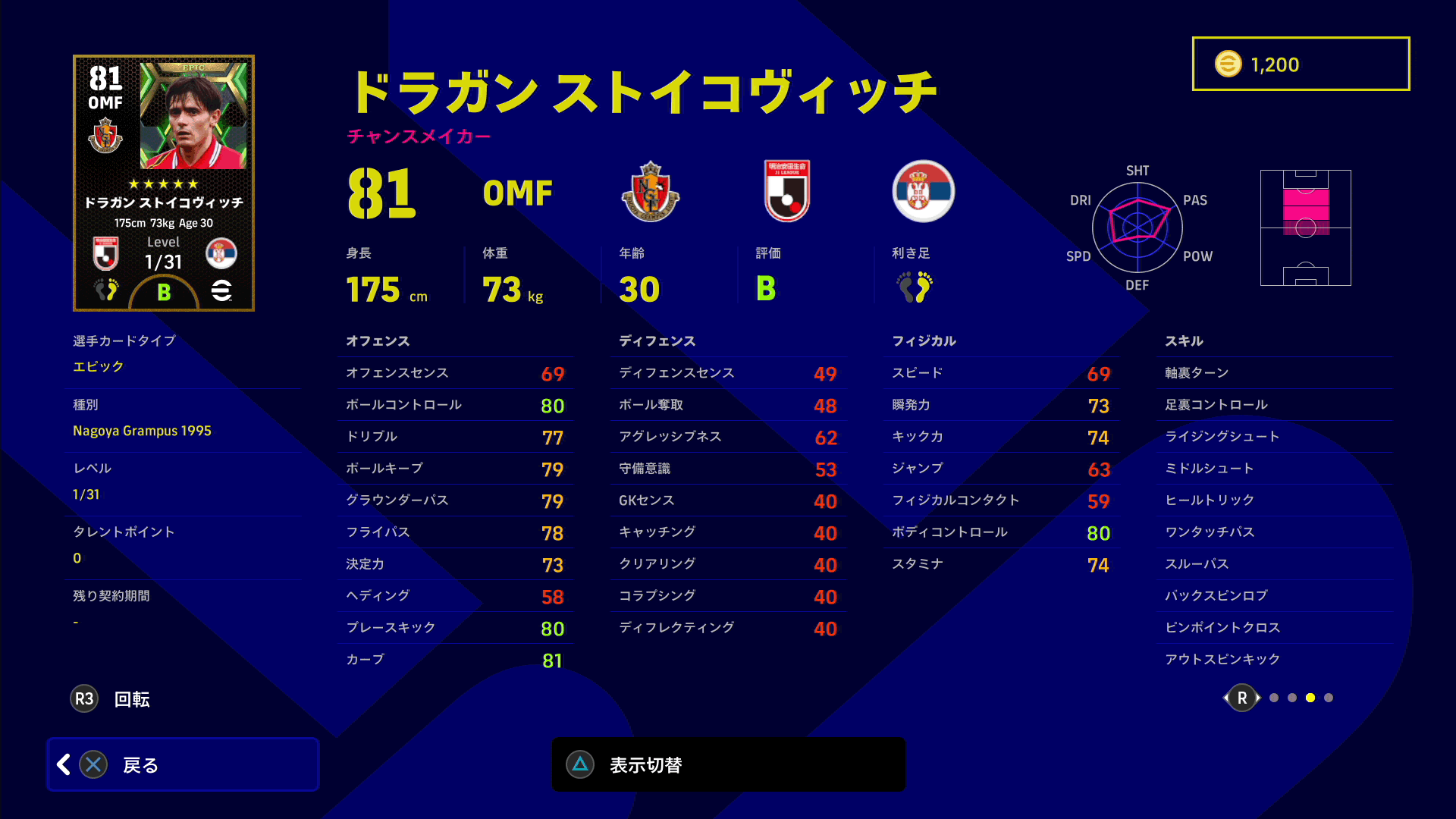 しかし、ドリブル・ボールキープ・ボディコントロールの能力値が非常に高いので、ドリブルの操作感は軽めです。